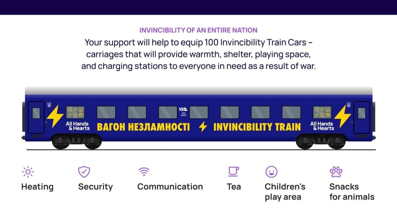 In response to devastating attacks on Ukraine's energy infrastructure that are leaving children & families without electricity and heat this freezing winter, All Hands & Hearts is joining forces with Ukrainian Railways to create 100 Invincibility Train Cars that provide warmth, shelter, play space for children, charging stations, Starlink internet, and more. These "mobile shelters" can be deployed to cities across Ukraine to give families a safe & welcoming place to go after attacks.